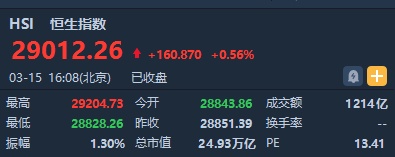 智通财经APP获悉,恒指早盘低开0.03%,随后震荡走高,重返两万九上方,临近午间收盘涨幅收窄,午后则维持横盘整理。截至收盘,恒生指数涨160.87点或0.56%,报29012.26点,全日成交额达1214.55亿。国企指数涨0.53%,报11508.17点,红筹指数涨0.84%,报4550.96点。