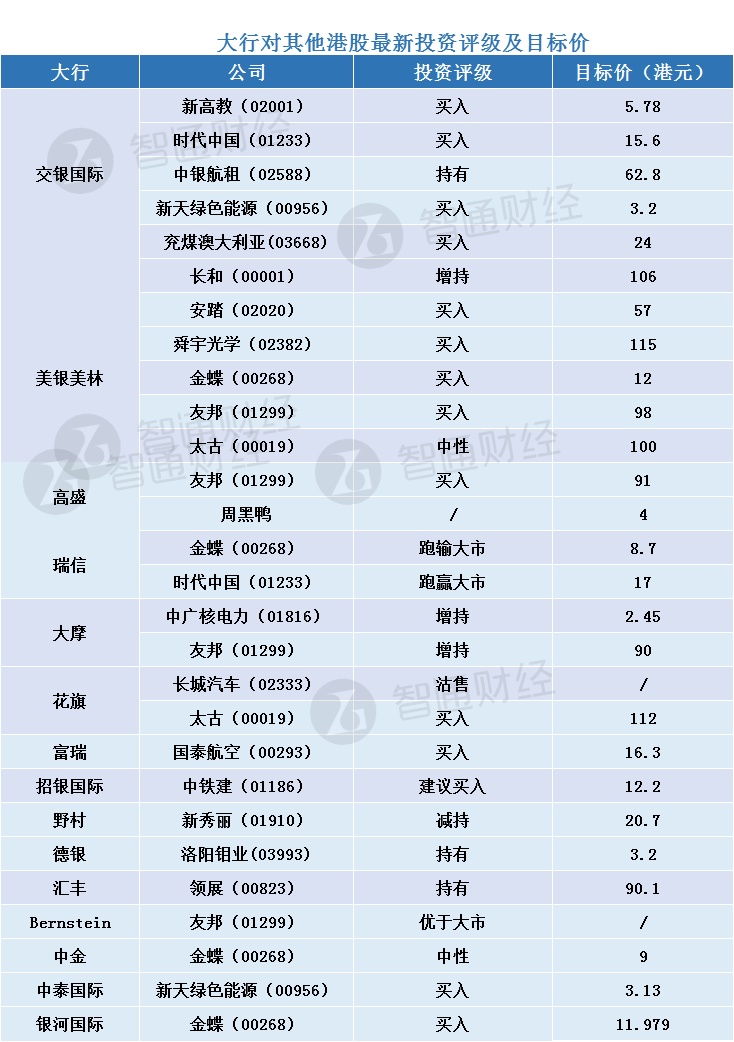 四、大行对其他港股最新评级与目标价