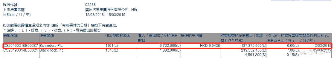 智通财经APP获悉,根据联交所资料显示,施罗德于3月13日增持广汽集团(02238)672万股,每股作价9.54港元,总值6410.88万港元,最新持股数目约1.87亿股,最新持股比例增至6.06%。