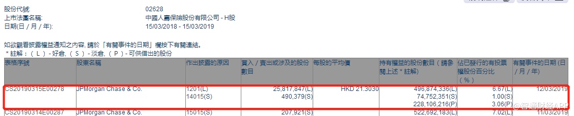 智通财经APP获悉,根据联交所资料显示,摩根大通于3月12日减持中国人寿(02628)2581万股,每股作价21.30港元,总值约5.5亿港元,最新持股数目约4.96亿股,最新持股比例减至6.67%。