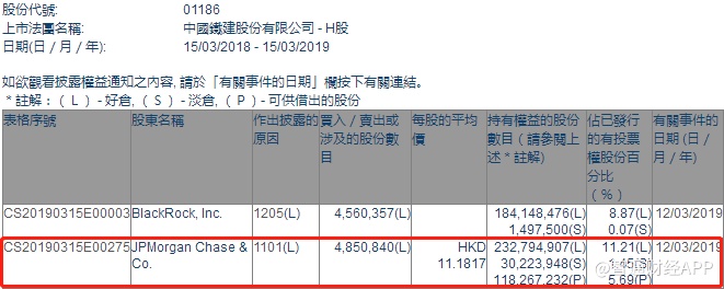 智通财经APP获悉,根据联交所资料显示,摩根大通于3月12日增持中国铁建(01186)485万股,每股作价11.18港元,总值约5422万港元,最新持股数目约2.32亿股,最新持股比例增至11.21%。