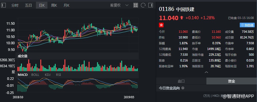 截至今日收盘,中国铁建(01186)涨1.28%,报11.04港元。