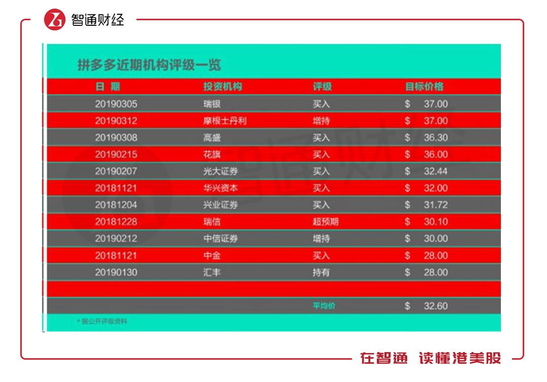 拼多多发布2018年财报前后,有多家券商投行机构给予其买入评级,其中瑞银及摩根士丹利给的目标价达37美元,相较于13日跌后价位有47.4%的涨幅空间。