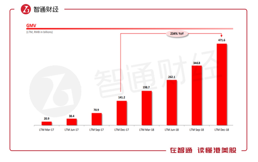 首先谈GMV,在电商领域,收入是GMV货币化非常重要的指标,智通财经APP了解到,拼多多过去12个月GMV达4716亿元,同比增长达234%。从季度看,该公司GMV呈指数级增长,2017年3月的年GMV仅为209亿元,2018年增长了21.6倍,季度复合增长率达56%。