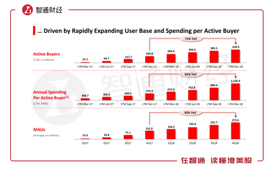 拼多多不仅年度活跃用户大幅增加,而且每个活跃用户年度付费也在大幅上升,2018年每个活跃用户年度付费1126.9元,同比增长95%,比年度活跃用户增长高出24个百分点,且从历史季度看,该数据增长幅度也远超过了年度活跃用户的增长水平。2018年该公司的DAUs为2.726亿户,同比增长93%,基本和活跃用户年度付费增长水平一致。