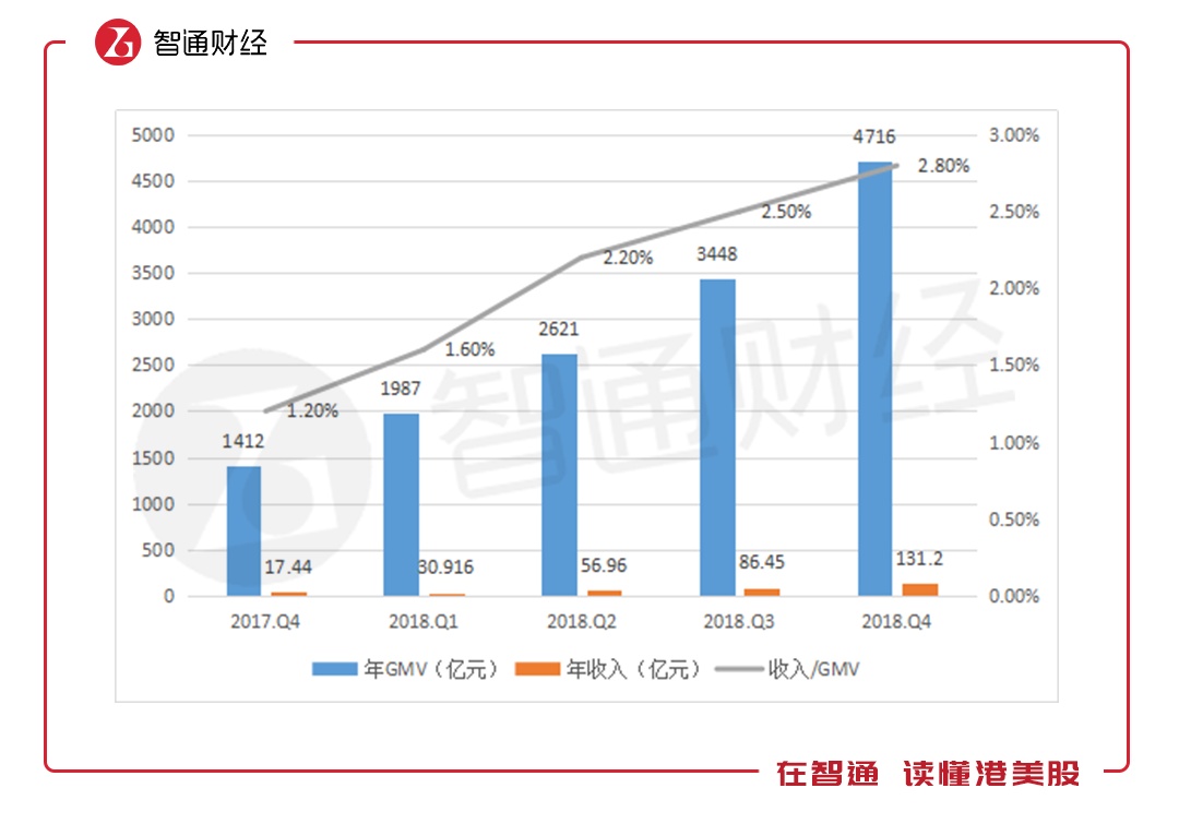 在保证GMV持续高增长的情况下,我们谈到货币化的问题,所谓的货币化就是收入与GMV的比值,代表在GMV这交易金额下,给电商平台带来了多少收入。智通财经APP了解到,拼多多的货币化率很低,但逐步上升的趋势,2018年的货币化率为2.8%,较2017年增加了1.6个百分点。