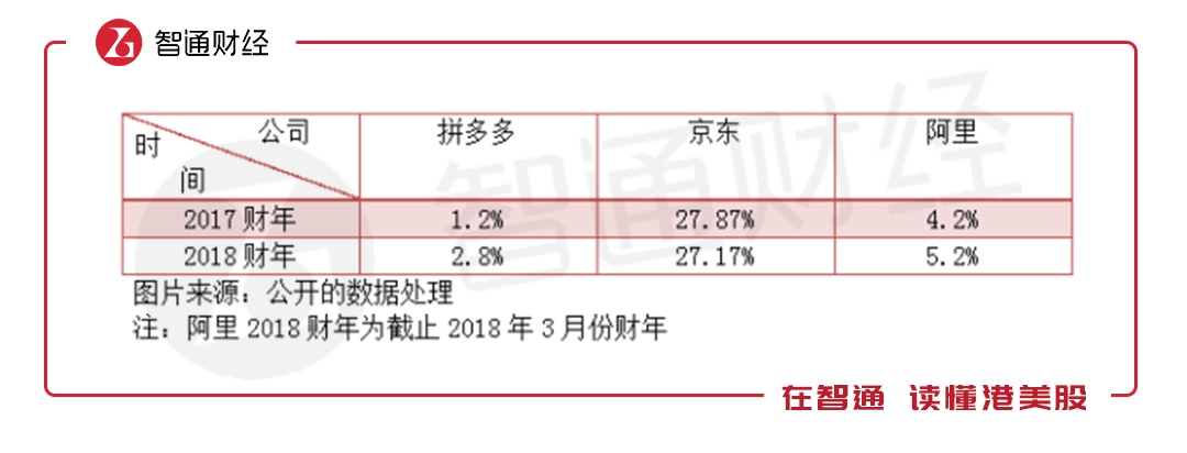 拼多多的成长速度迅猛,2018年,全国网上零售总额同比增长23.9%,该公司全年收入增速是行业的26倍,同年京东的收入及毛利分别增长27.5%和29.8%,仅略高于行业水平,相当于拼多多对应成长速度的1/24及1/30。虽然拼多多业绩高速成长,但就盈利而言,目前仍是亏损的。