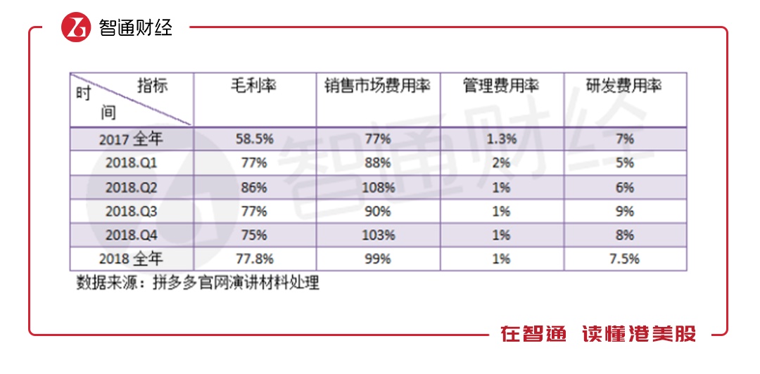 实际上,做第三方的电商平台基本不存在固定成本,也不存在进货成本,因此毛利率是超高的,主要烧钱方向各项费用支出。根据拼多多演讲文件,2018年该公司亏损加大主要是销售及市场费用大幅增加所致,而管理费用率及研发费用率维持较为稳定。