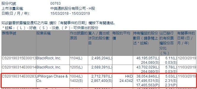 智通财经APP获悉,根据联交所资料显示,摩根大通于3月11日增持中兴通讯(00763)271万股,每股作价24.43港元,总值约6620万港元,最新持股数目约3805万股,最新持股比例增至5.03%。