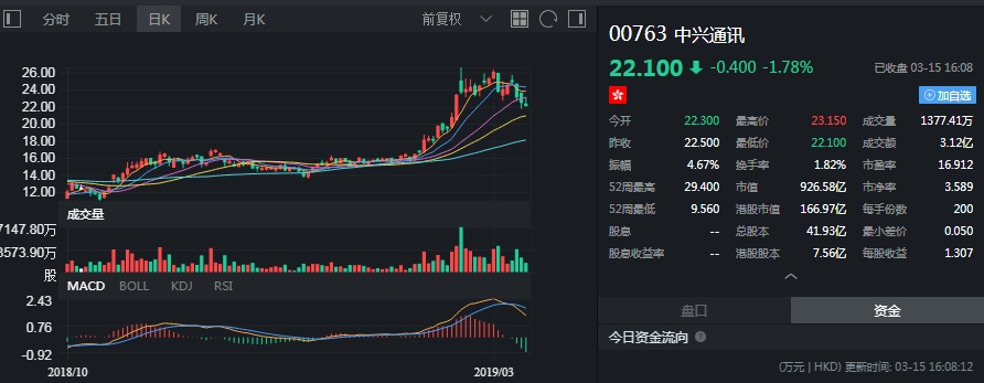 截至今日收盘,中兴通讯(00763)跌1.78%,报22.10港元。