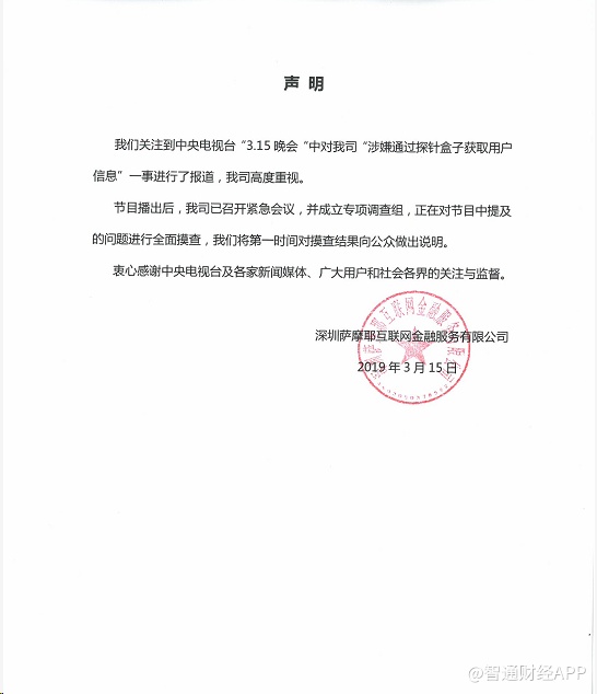 智通财经APP获悉,3月15日,2019年中央广播电视总台3·15晚会今日举行,在预告片中,央视曝光了缺德的骚扰电话、“714高炮”要钱更要命等事件。其中,在“缺德的骚扰电话”案例中,赫然出现了“萨摩耶金服”的名字,央视报道,萨摩耶涉嫌放置探针盒子收集用户个人信息。对此,萨摩耶金服回应称,已成立专项调查组,正对节目中提及的问题进行全面摸查。