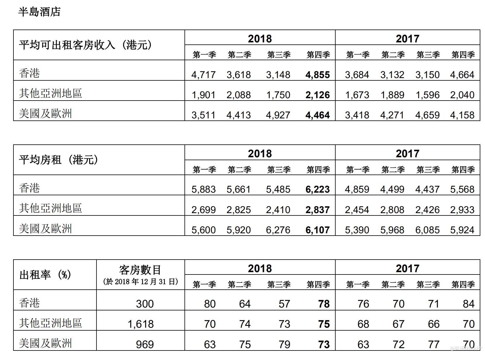 从出租率来看,2018年第4季度,中国香港地区,半岛酒店客房数达300间,出租率为78%,同比减少6个百分点;其他亚洲地区,半岛酒店出租率达75%,同比增长5个百分点;平均房租;美国及欧洲地区,出租率达73%,同比增长3个百分点。