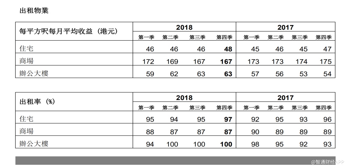 出租率方面,集团住宅和办公大楼,2018年四季度的出租率分别为97%和100%几乎饱和,商场的出租率也达到87%和过往季度差别不大。