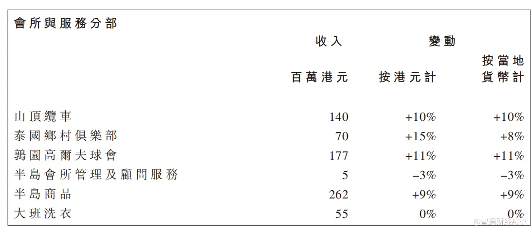 会所与服务业务方面,2018年来自山顶缆车、高尔夫球会及半岛商品的营收增速较快,分别增长10%、11%和9%。。