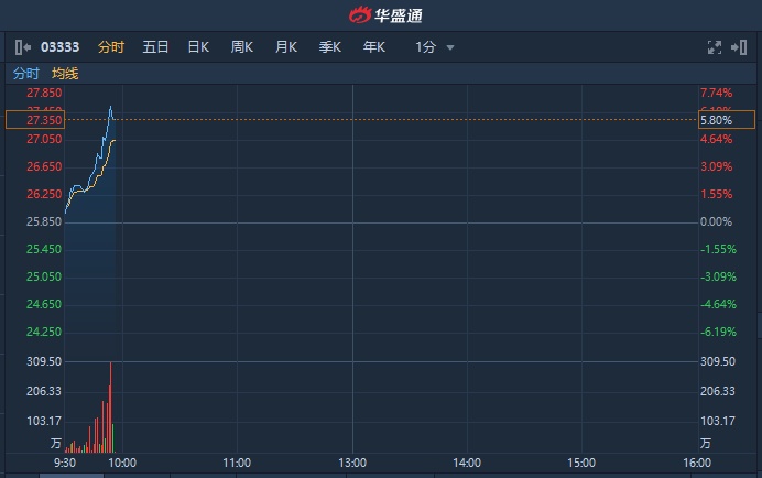 智通财经APP获悉,中国恒大(03333)早盘获强力拉升,截至9时55分,涨5.8%,报27.35港元,成交额达4.685亿港元。