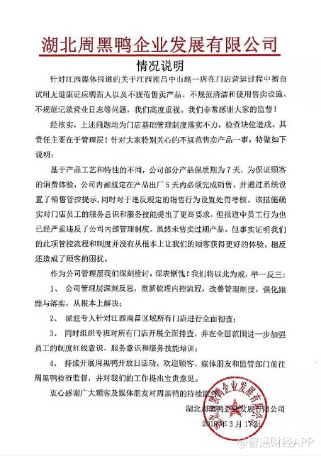 “3·15”期间,江西媒体曝光周黑鸭(01458)江西南昌一店出售过期产品,店员用还在保质期的产品条形码代替,且不给购物小票。昨日晚间,周黑鸭官方微博针对该事件做出了回应称,上述问题均为门店管理不到位,公司管理层将完善管理制度,并彻查江西南昌区域所有门店。完整版“情况说明”如下: