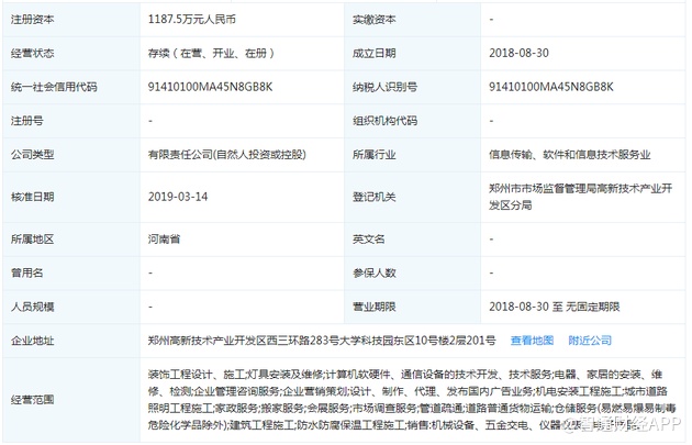 据公开资料显示,河南匠多多信息科技有限公司成立于2018年8月30日,注册资本1187.5万元,经营范围包括装饰工程设计、施工、灯具安装及维修、计算机软硬件、电器家具的安装、家政服务、搬家服务、仓储服务、建筑工程施工等。