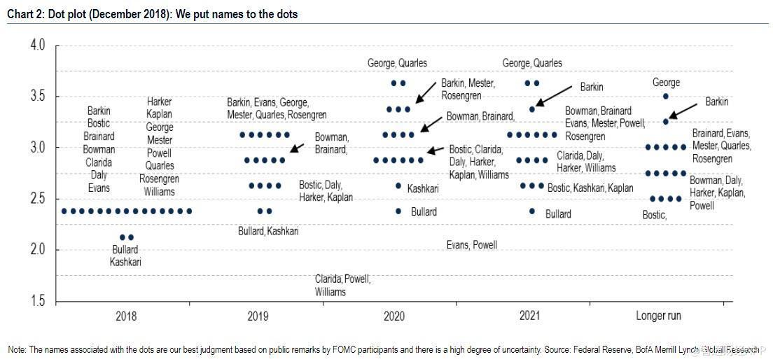 根据2018年12月公布的利率预期的点阵图,我们可以看到,如果将2019年中值预期调整为加息一次,还需要3位官员转变态度。美国银行表示,联邦公开市场委员会的一些核心成员在12月时预计2019将有两次加息。但这几个月来,这些美联储官员似乎已重新审视了加息可能会带来的市场风险。
