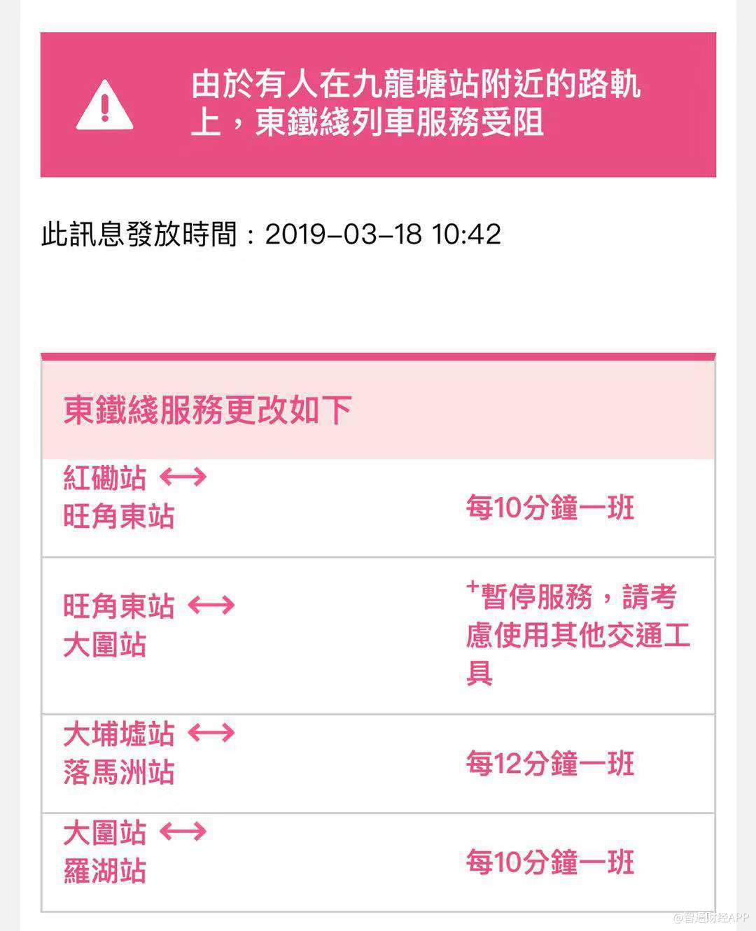 智通财经APP获悉,3月18日凌晨,港铁(00066)荃湾线因信号测试导致两列车相撞后,金钟站至中环站全日暂停服务。此后,在上午10时42分,旺角东站至大围站再度出现事故。据悉,东铁线九龙塘站有人进入轨道范围,旺角东来回大围站服务目前暂停。