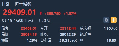 截至收盘,恒生指数涨396.75点或1.37%,报29409.01点,全日成交额达1168.91亿。国企指数涨1.45%,报11674.83点,红筹指数涨2.85%,报4680.80点。