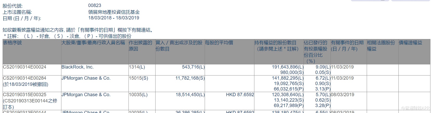 智通财经APP获悉,根据联交所资料显示,摩根大通于3月8日增持领展房产基金(00823)1851万股,每股作价87.65港元,总值约16.22亿港元,最新持股数目约1.2亿股,最新持股比例增至5.7%。