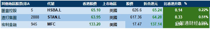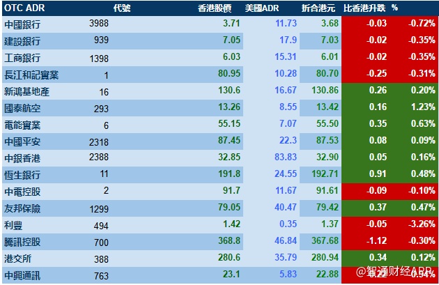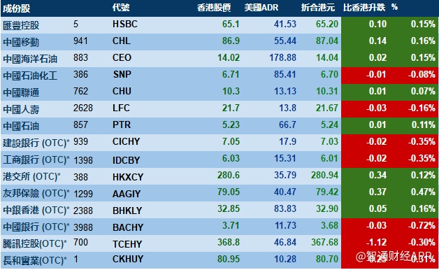 智通财经APP获悉,隔夜港股ADR指数走软,收报29397点,跌11.53点或0.04%。腾讯控股收报368.8港元,较港收市跌1.12元。友邦保险收报79.42元,较港收市升0.37元;汇丰控股收报65.2元,较港收市升0.1元;香港交易所收报280.94元,较港收市升0.34元。