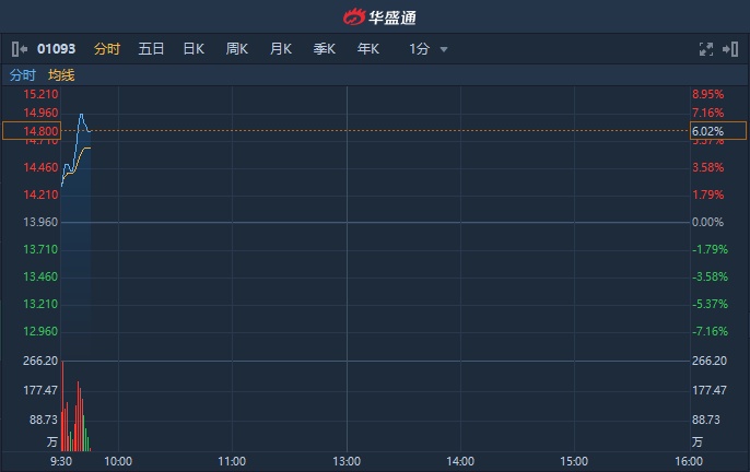 智通财经APP获悉,石药集团(01093)早盘高开高走,放量突破半年线,截至9时43分,涨6.02%,报14.8港元,成交额达2.616亿港元。