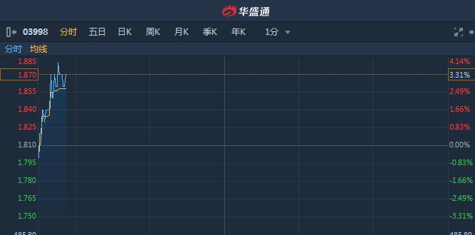 智通财经APP获悉,波司登(03998)早盘一度涨至1.88港元,创近六年新高,且获招银国际看高至2.04港元,评级“买入”。截至9时51分,涨3.31%,报价1.87港元,成交额2313万。
