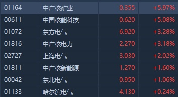 智通财经APP获悉,核电股早盘普涨,截至发稿,中广核矿业(01164)涨5.97%,中国核能科技(00611)涨5.08%,东方电气(01072)涨3.28%,中广核电力(01816)涨3.18%,上海电气(02727)涨2.02%。