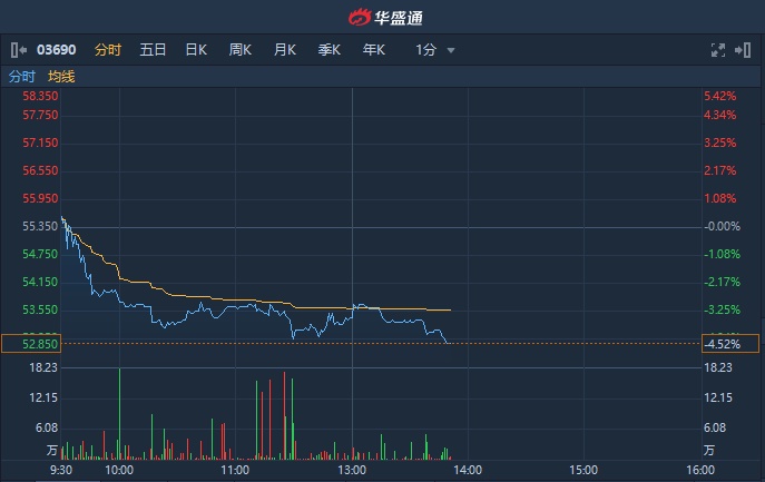 智通财经APP获悉,前两日股价回暖的美团(03690)今日又遭抛压,卖盘近95%,股价一路震荡走低,截至13时50分,跌4.52%,报52.85港元,成交额达1.659亿港元。