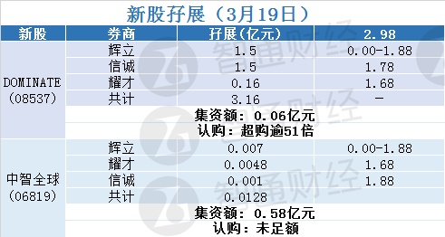 智通财经APP获悉,DOMINATE(08537)以及中智全球(06819)正在招股中,截至3月19日,辉立、耀才以及信诚等券商分别为其借出3.16亿和0.58亿;中智全球(06819)孖展未足额,DOMINATE(08537)超购逾51倍。