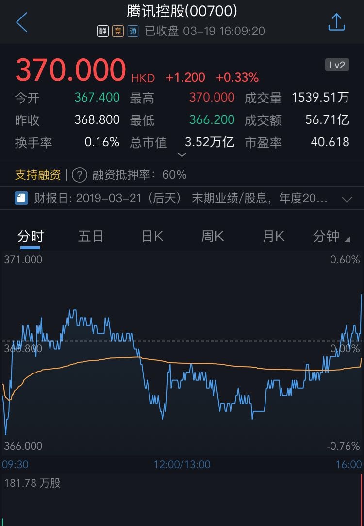截至今日收盘,腾讯控股(00700)涨0.33%,报370港元。