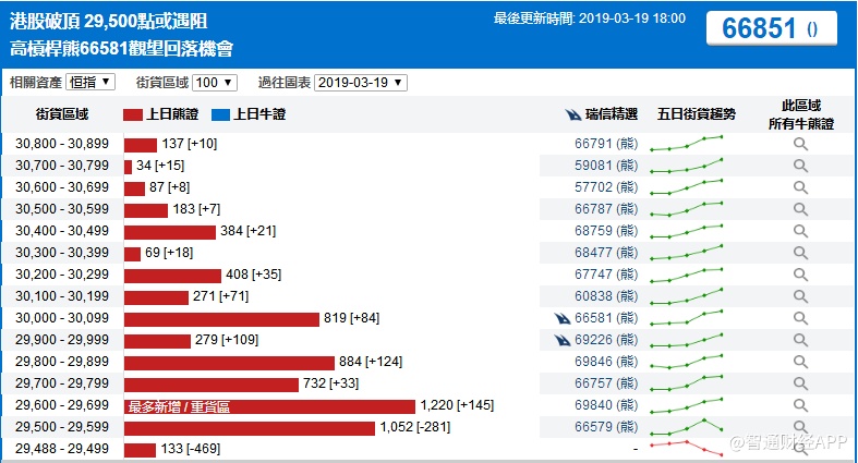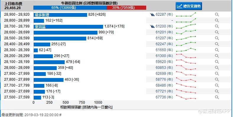 智通财经APP获悉,截至3月19日,恒指最新的牛熊街货比例65:35。从瑞信恒指牛熊证街货分布图中得到的数据显示,熊证街货重货区在29600-29699区间,该区间最新熊证数量为1220张,较上一交易日增加145张;最多新增区间亦在该区间。牛证街货重货区在28700-28799区间,该区间最新牛证数量为1074张,比上一交易日增加176张;最多新增为28900-28920区间,新增张数826张。