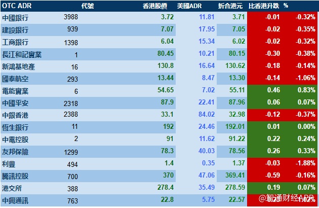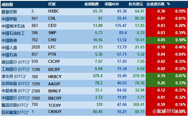智通财经APP获悉,受美股由升转跌影响,港股ADR指数报29415点,跌50.98点或0.17%。腾讯控股收报369.41港元,较港收市跌0.59港元;汇丰控股收报64.97港元,较港收市跌0.38港元;香港交易所收报278.59元,较港收市升0.19元。