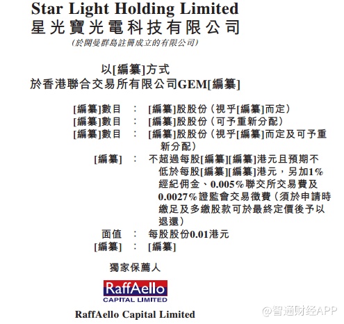 智通财经APP获悉,据港交所披露,3月19日,星光宝光电科技有限公司向港交所创业板递交上市申请,RaffAello Capital Limited为其独家保荐人。
