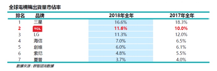 2018年公司液晶显示(LCD)电视机销售量达2861万台,同比大幅增长23.1%,超额完成调升后全年目标2830万台,再创历史新高。根据群智咨询数据显示,公司2018年全球电视机出货量市场占有率为11.6%,从全球来看排名上升一位至第二,这也是中国电视机品牌首次出货量市占率位居全球前二,排名遥遥领先其它国内品牌。