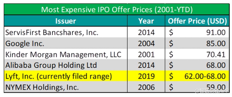 如果Lyft,Inc在目前提交的62.00美元至68.00美元的范围内进入市场,它将成为自2001年以来所有IPO交易中第五只定价最高的股票。