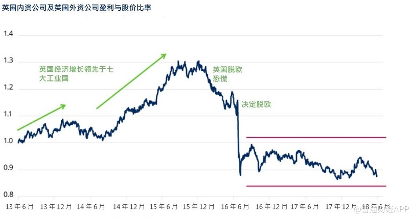 在2013年中至2015年底期间,英国经济领先全球,英镑强劲,英国内资公司领先于以海外盈利为主的英国公司。之后,随着英国投票脱离欧盟,英国内资公司明显落后。汇率是其中的主要驱动因素,因为市场认为英镑贬值能够为以海外盈利为主的公司带来汇兑收益。然而,这在很大程度上也是由于英国内资公司出现“评级下调”,市场担忧未来英国经济增长在离开欧盟之后将会下降。