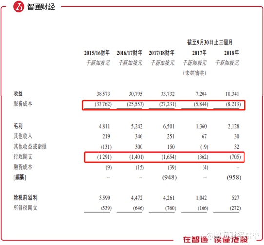 可以看出,坤集团的收入波动很大,但是从2015/16财年至今大体成下降趋势,年复合下降6.4%。不过好在服务成本控制得当,毛利呈上升趋势。近三个财年分别录得481、524及650万新元,年复合增长16.4%。另外由于行政支出的波动,三年税前溢利有小幅增长。