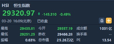 截至收盘,恒生指数跌145.31点或0.49%,报29320.97点,全日成交额达1031.69亿。国企指数跌0.53%,报11624.98点,红筹指数跌0.49%,报4644.03点。