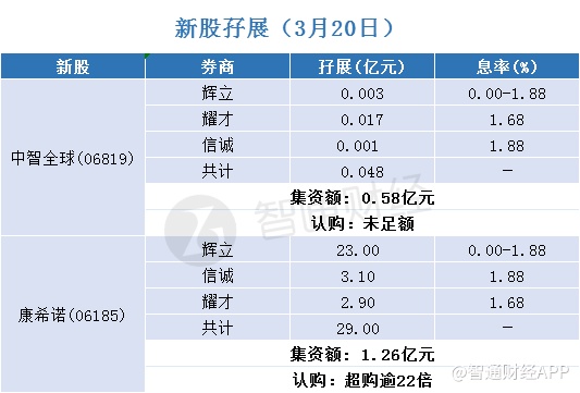 智通财经APP获悉,康希诺(06185)以及中智全球(06819)正在招股中,截至3月20日,辉立、耀才以及信诚等券商分别为其借出29亿和0.58亿;中智全球(06819)孖展未足额,康希诺(06185)超购逾22倍。