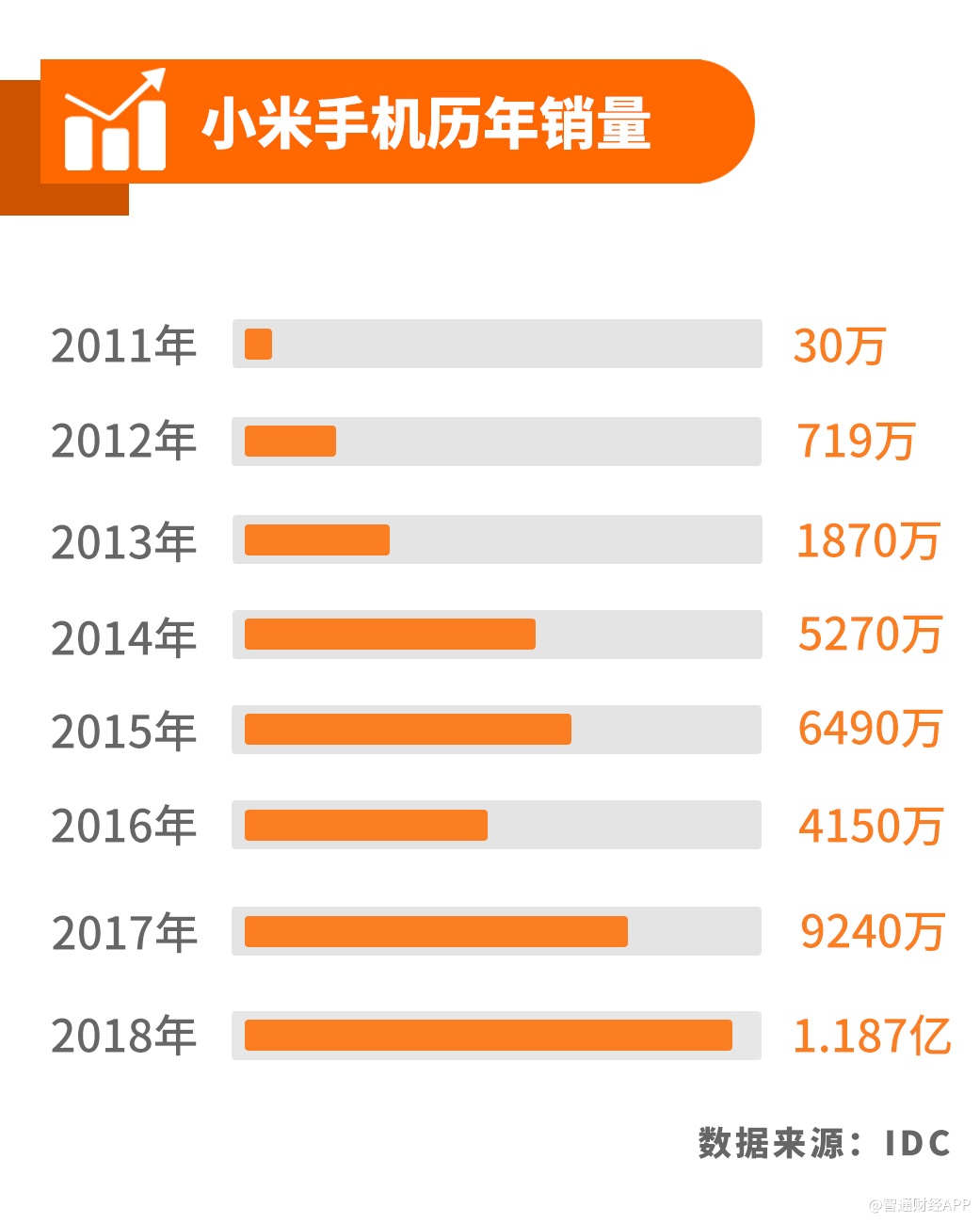 销量方面,2018年小米售出约1.187亿部智能手机,同比增长近30%,与之形成鲜明对比的是,同年全球智能手机出货量同比下滑4.1%,为连续第二年负增长,其中,中国市场更是大跌10.5%。