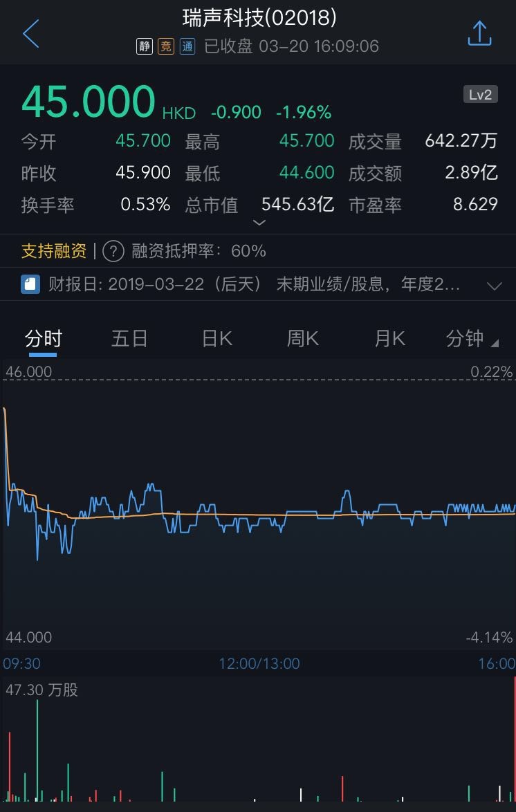 截至今日收盘,瑞声科技(02018)跌1.96%,报45.00港元。