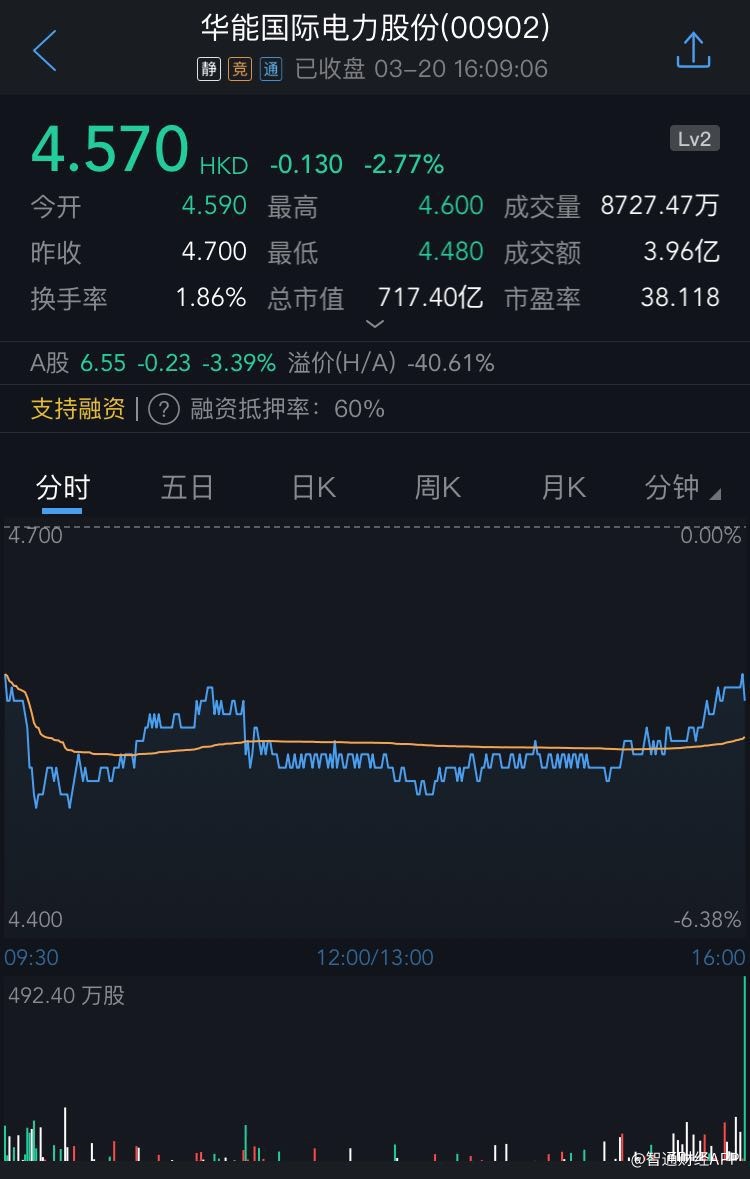 截至今日收盘,华能国际电力(00902)跌2.77%,报4.57港元。