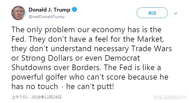 特朗普曾在自己的推特里写道:“我们经济中的唯一问题就是美联储,他们对市场没有感觉,他们不了解贸易摩察、强美元是必要的。”