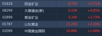 智通财经APP获悉,美联储超预期鸽派,预计今年不再加息,利好金价,COMEX黄金期货创本月以来新高,港股黄金股整体走高。截至11时11分,招金矿业(01818)涨5.71%,报价8.7港元,紫金矿业(02899)涨3.73%,山东黄金(01787)涨3.16%,中国黄金国际(02099)涨1.68%。