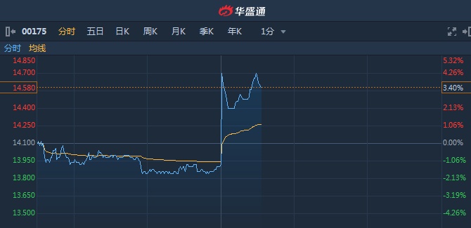 智通财经APP获悉,吉利汽车(00175)午间公布2018年度业绩,净利同比增18%至126.7亿元人民币,午后股价直线拉升。截至13时32分,涨3.4%,报价14.58港元,成交额8.556亿。