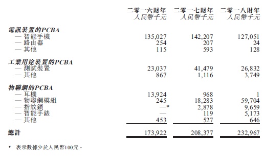 下表陈列于往记录期间该公司PCBA的最终电子产品划分的销售PCBA所得收益明细: