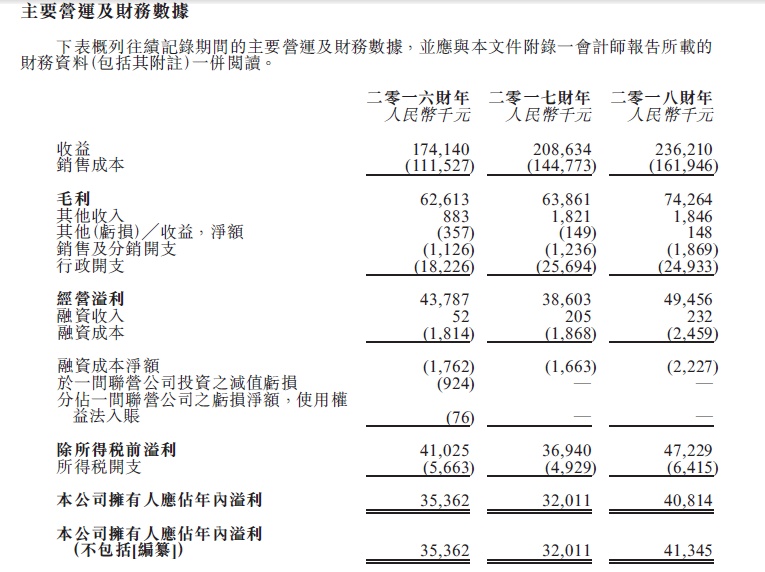 该公司的收益由2016财年约1.74亿元人民币增加约19.8%至2017财年约2.09亿元人民币,主要由于该公司2017财年的电讯专职及工业用途装置PCBA销量增加约2630万人民币。该公司收益由2017财年约2.09亿元人民币增加约13.2%至2018财年约2.36亿元人民币,主要由于客户对该公司PCBA服务需求增加。于2016财年、2017财年及2018财年,该公司分别获得毛利约6260万人民币、6390万人民币以及7430万人民币,毛利率分别约为36.0%、30.6%以及31.4%。该公司的纯利率由2016财年的约20.3%下降至2017财年的约15.3%并于2018财年上升至17.5%。