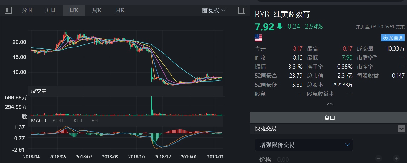 禁民办幼儿园上市新政发布后,红黄蓝股价再度暴跌。美股开盘后跳水32.37%,随后跌幅快速扩大超50%,盘中一度触发熔断机制,当日收跌52.97%至7.83美元,市值蒸发近3亿美元。